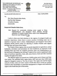 ತೀವ್ರ ಜಲಕ್ಷಾಮಕ್ಕೆ ತುತ್ತಾಗಿರುವ ಕೋಲಾರ, ಚಿಕ್ಕಬಳ್ಳಾಪುರ ಹಾಗೂ ಬೆಂಗಳೂರು ಗ್ರಾಮಾಂತರ ಜಿಲ್ಲೆಗಳಿಗೆ ಕುಡಿಯುವ ನೀರಿನ ಉದ್ದೇಶಕ್ಕಾಗಿ ಕೃಷ್ಣಾ ನದಿಯಿಂದ ಹೆಚ್ಚುವರಿ ನೆರೆ ನೀರು ಹರಿಸುವ ಬಗ್ಗೆ ಆಂಧ್ರ ಪ್ರದೇಶದ ಮುಖ್ಯಮಂತ್ರಿಗಳಾದ ಎನ್. ಚಂದ್ರಬಾಬು ನಾಯ್ಡು ಅವರಿಗೆ ಕೋಲಾರ ಸಂಸದ ಮಲ್ಲೇಶ್ ಬಾಬು ಅವರು ಮನವಿ ಸಲ್ಲಿಸಿದರು.