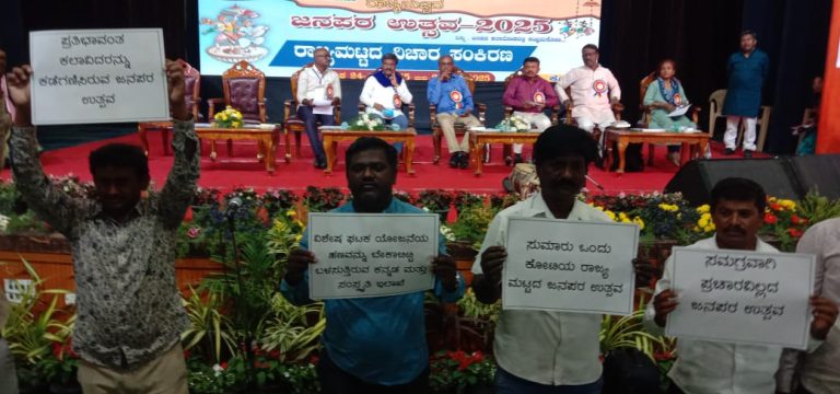 ಜನಪರ ಉತ್ಸವದ ಹೆಸರಲ್ಲಿ ದಲಿತರ ಹಣ ಬೇಕಾಬಿಟ್ಟಿ ಖರ್ಚು ಖಂಡಿಸಿ ವೇದಿಕೆ ಮುಂಭಾಗ ಮೌನ ಪ್ರತಿಭಟನೆ,